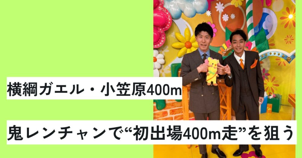 フジテレビ系バラエティ『千鳥の鬼レンチャン』の人気企画「男子400m走サバイバルレンチャン」に、お笑いコンビ・横綱ガエルの小笠原400mさんが初出場します。